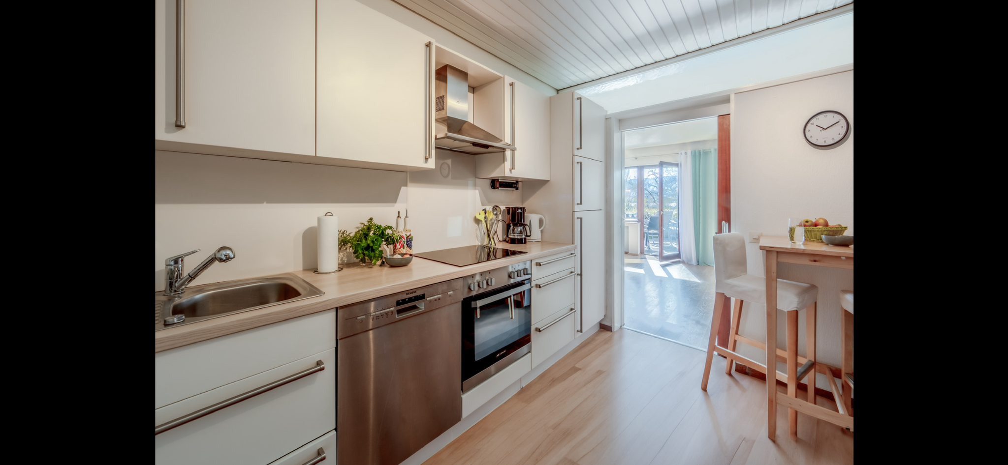 Vierplattenherd, Kühlschrank mit Gefrierfach, Spülmaschine, Backofen, Geschirr für 6 Personen