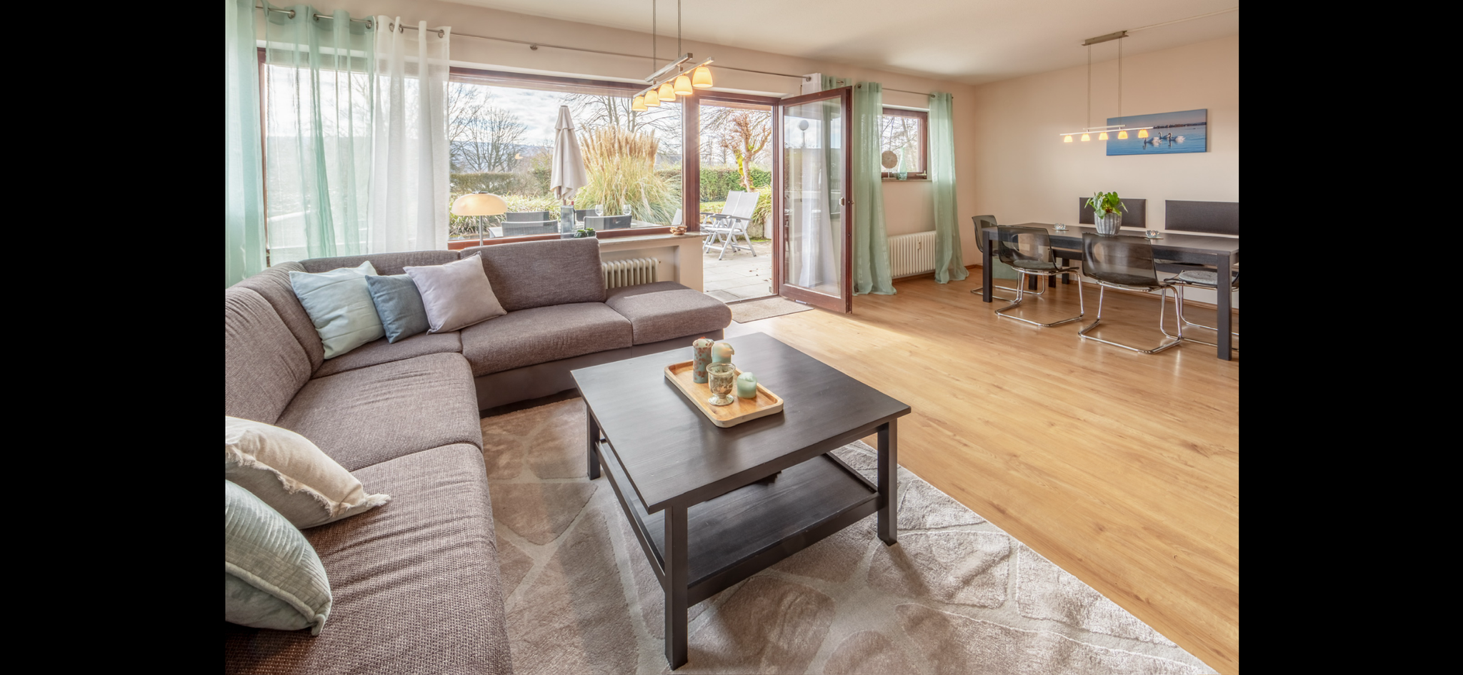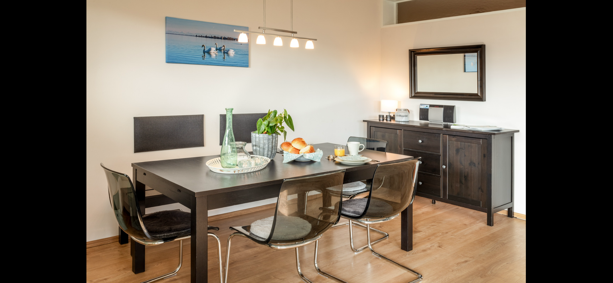 Sofa, großer Esstisch, Fernseher, W-Lan